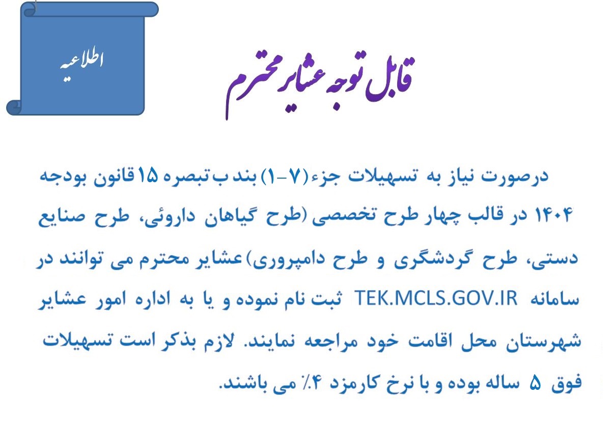 از همه عشایر گرامی درخواست میشود در تکمیل و ارائه اطلاعات دقیق با ماموران سرشماری اهتمام و همکاری کامل داشته باشند. از همراهی و مشارکت شما عزیزان سپاسگزاریم.